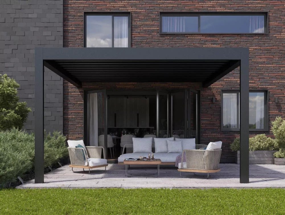 Elektrische Lamellen-Pergola 300×300 cm – Wandmontage, Aluminium, motorisiert