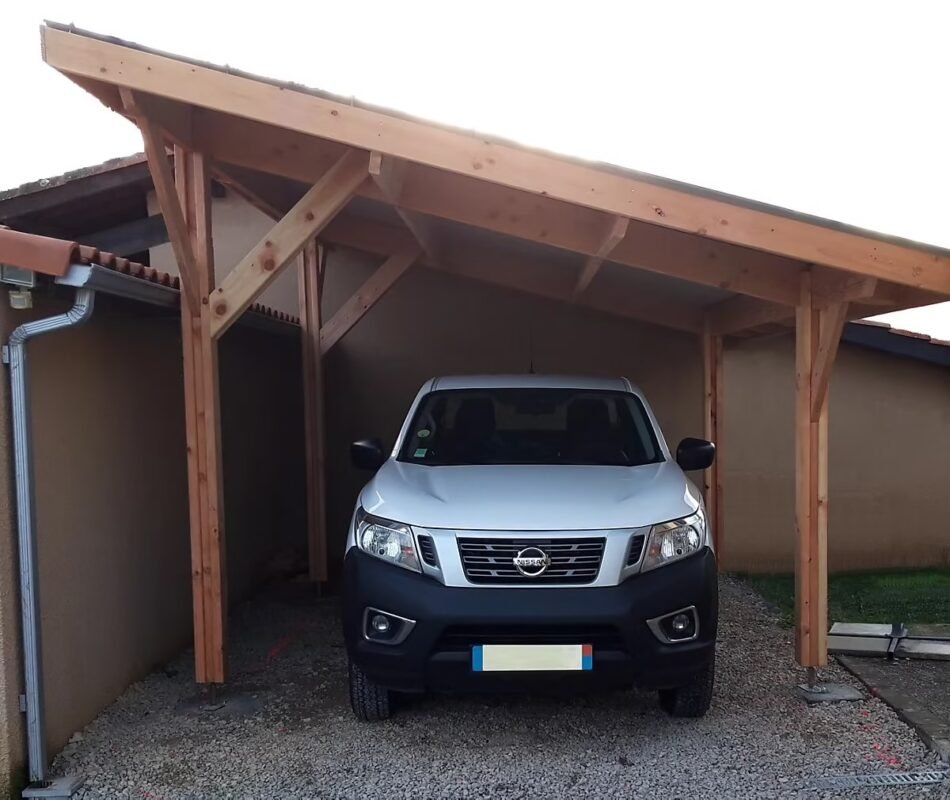 Einseitig geneigter Carport 350 cm x 550 cm, französische Douglasie, PEFC-zertifiziert (Rahmen – Markise – Carport), 20 m² Nutzfläche
