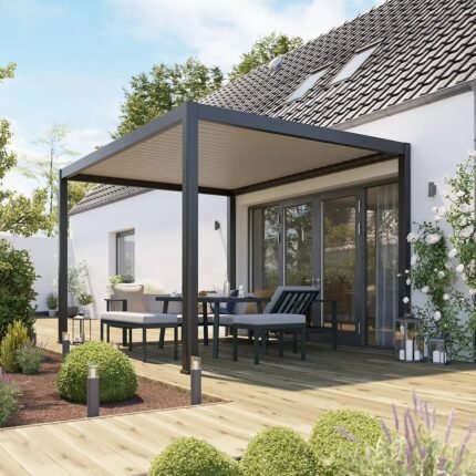 Die 3 x 4 m große, bioklimatische Pergola BREVA von Klikstrom erweitert Ihren Wohnraum nach draußen – bei jedem Wetter. Die motorisierte Pergola verfügt über verstellbare Lamellen, die je nach Bedarf Schatten spenden oder Sonnenlicht hereinlassen. Auf einer Terrasse neben dem Haus installiert, bietet sie Schatten und Kühle und trägt so im Sommer zu einem angenehmeren Raumklima bei. Im geschlossenen Zustand schützen die wasserdichten Lamellen zuverlässig vor Regen und Nässe. Zusätzlich ist die Pergola mit integrierter LED-Beleuchtung ausgestattet, mit der Sie durch verschiedene Farben unterschiedliche Stimmungen erzeugen und Ihren Außenbereich auch abends genießen können. Dank ihrer großzügigen Abmessungen und der hochwertigen Materialien ist die bioklimatische Pergola BREVA ein schönes und funktionales Produkt, an dem Sie das ganze Jahr über Freude haben werden!