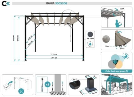 Freistehende Pergola mit Lamellendach Abmessungen : 291x291x220cm (BxTxH) Gestell: Stahl mit Epoxidharz - RAL 7016 Klingen: Stahl & Polyester - Beige Inkl. Zubehör und spezifische Schrauben Cazeboo ist auf Tore und Tore im Bausatz spezialisiert, die Sie selbst zusammenbauen und installieren können Die Pergola mit Lamellendach BAHIA ist die unumgängliche Outdoor-Einrichtung, um den Frühling und den Sommer maximal zu genießen! Als freistehende Pergola ermöglicht Ihnen das Modell BAHIA, einen geschützten Lebensraum im Freien zu genießen, ohne dass Sie eine Wand als Stütze benötigen. Ein freistehender Pavillon mit Lamellendach ist eine gute Alternative, wenn Ihre Wand für eine Befestigung nicht stabil genug ist oder wenn Sie Ihre Fassade einfach nicht beschädigen wollen Dank seiner Größe können Sie einen geschützten Raum von 9m² nutzen, um sich dort bequem mit Ihren Freunden oder Ihrer Familie zu besinnen. Unsere Pergolen BAHIA mit verstellbaren Lamellen sind Modelle, die sowohl Robustheit dank ihrer Stahlstruktur als auch Ästhetik mit ihrem modernen und eleganten Design vereinen. Sie genießen täglichen Komfort dank der sehr breiten und bis zu 160 Grad verstellbaren Lamellen, die sich mithilfe einer Kurbel manuell neigen lassen. So können Sie den Grad der Sonneneinstrahlung den ganzen Tag über selbst bestimmen und von einer persönlichen Beschattung profitieren. Beschreibung: Pergola mit verstellbaren Lamellen, freistehend Material Gestell: Epoxidstahl Gestellfarben: Anthrazitgrau Material der Lamellen: Stahlrahmen mit Polyester-Abdeckung Lamellenfarben: Beige Neigung der Lamellen: 0° bis 160° Abmessungen: Breite 291 cm x Länge 291 cm Überdachte Fläche: 9 m² Durchgangshöhe geschlossene Lamelle: 215 cm Durchgangshöhe offene Lamelle: 197 cm Neigung der Lamellen: 0° bis 160° Dieser Bausatz für eine Lamellendach Pergola den Sie selbst zusammenbauen und installieren, enthält: - Struktur aus Epoxidstahl - 4 Pfosten aus Epoxidstahl (60x60x0,9 mm) - 7 Lamellenrahmen aus Stahl - 7 Polyesterabdeckungen 180g/m² für die Lamellen (Farbe Beige) - 1 Kurbel, um die Lamellen neigen zu können - Verankerungsset für Beton- oder Holzböden - Schrauben und Bolzen Die Lamellen bestehen jeweils aus einem Stahlrahmen, den man zusammenbauen muss, und einer Polyesterabdeckung, die man auf jede Lamellen aufzippen muss. Die Abdeckung aus Polyester hat den Vorteil, dass sie wasserabweisend ist, was einen besseren Schutz vor Regen ermöglicht. Um Ihnen eine bessere Farbbeständigkeit gegenüber der Sonne zu bieten, wurden unsere BAHIA Lamellenpergola einer Color Fastness-Behandlung (Grad 5) auf der Oberfläche unterzogen. Dieses Lamellendach ist ideal für den Einsatz im Frühling und Sommer, es wird Sie vor leichten Unwettern schützen. Bei regnerischem Wetter ist es ratsam, die Dachplane von der Struktur zu entfernen, da sie weiterhin wasserdurchlässig ist. Wenn Sie eine bioklimatische Pergola kaufen möchten, die allen Wetterbedingungen standhält und das ganze Jahr über genutzt werden kann, empfehlen wir Ihnen unser Modell der Lamellenpergola SANTA. Bestehend aus einem Gestell aus Aluminium und verstellbaren Dachlamellen aus Stahl ist das Modell SANTA völlig wetterfest. Das Modell BAHIA ist auch in der Größe 400 x 300 cm und in der Farbe Anthrazitgrau erhältlich. Gibt es auch als Anbauversion (siehe Unterkategorie «Anbau Lamellendach») Die Lamellen Pergola BAHIA wurde entworfen, um Ihnen alle Funktionen einer bioklimatischen Stahlpergola zu bieten und gleichzeitig von einem Cazeboo-Preis zu profitieren. Pergola Lamellendach wird als Bausatz geliefert. Klare Anleitung, einfacher und schneller Aufbau. Alle notwendigen Informationen zu diesem Produkt finden Sie in den technischen Daten.