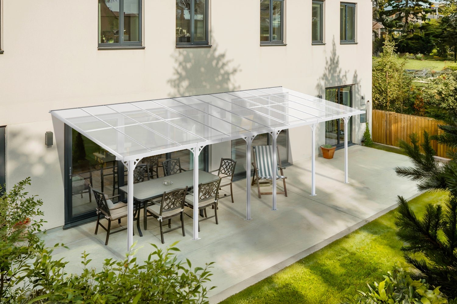 Polycarbonat ist bekannt für seine Leichtigkeit, seine bemerkenswerte Dichtigkeit und seine hohe Widerstandsfähigkeit gegen Stöße und Stöße. Da es viel weniger zerbrechlich als Glas ist, wird es häufig für Dächer von Pergolen oder Carports verwendet.