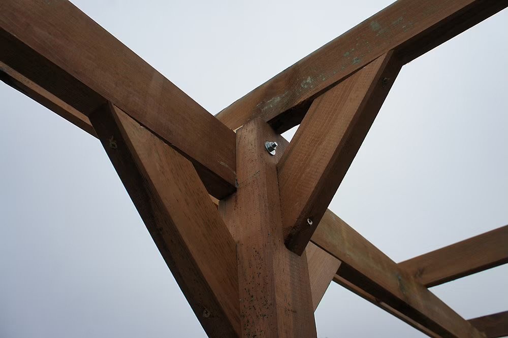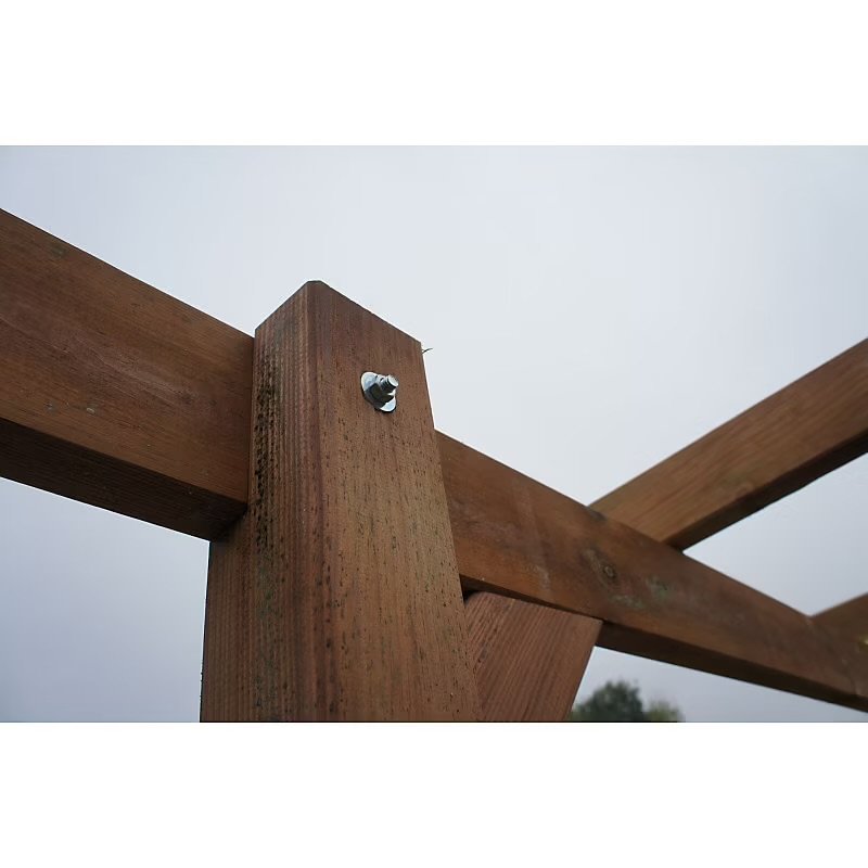 - Im Lieferumfang sind alle für den Aufbau der Holzkonstruktion benötigten Beschläge und Bauteile enthalten. Ebenfalls enthalten sind 6 korrosionsbeständige, verzinkte Stahlpfostenfüße, die sich leicht auf Betonfundamenten befestigen lassen (die passenden Schrauben zur Befestigung der Holzpfosten an den Stahlfüßen sind ebenfalls enthalten. Ankerbolzen zur Verankerung der Füße im Boden sind separat erhältlich).