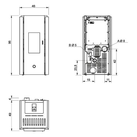 - Mindestabstand zu brennbaren Materialien: hinten 100 mm – seitlich 100 mm – vorne 800 mm