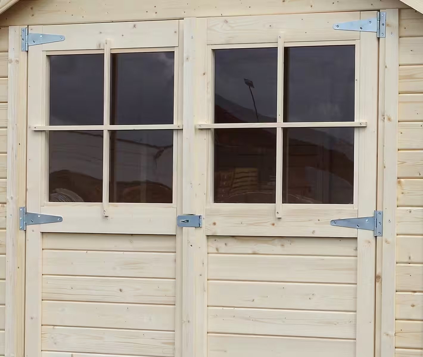 Bitte beachten Sie, dass farbig behandelte Gartenhäuser aufgrund des einseitigen Anstrichs nicht spiegelverkehrt montiert werden können!