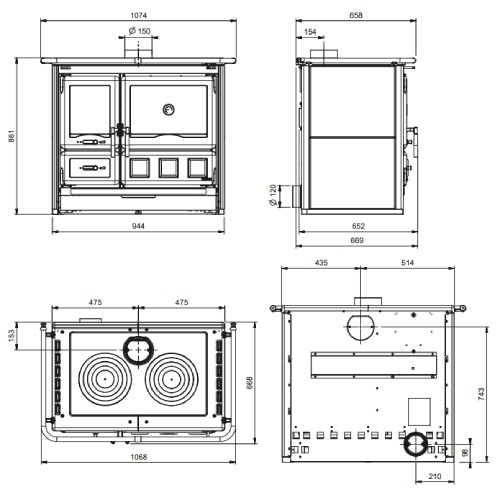 Der Rauchrohranschluss mit Ø 150 mm kann oben, hinten oder seitlich angebracht werden. Zusätzlich ist eine externe Luftzufuhr möglich, um die Verbrennung noch effizienter zu gestalten. Die Mindestabstände zu brennbaren Materialien (hinten 300 mm, oben 400 mm, vorne 1000 mm) gewährleisten einen sicheren Betrieb. Entscheiden Sie sich jetzt für den La Nordica Holzherd Verona XXL und genießen Sie die Kombination aus starker Heizleistung, komfortabler Kochmöglichkeit und nachhaltigem Betrieb - in einem Gerät, das Funktionalität, Qualität und Effizienz vereint.LA NORDICA HOLZHERD VICENZA EVO