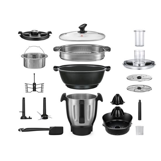 Kombiniert 12 Funktionen: Kochen, Köcheln, Anbraten, Dämpfen, Kochen, Kneten, Mixen, Emulgieren, Schlagen, Pürieren, Mahlen, Zitruspresse.